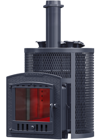 Масса пароиспарителя в печи Авангард 24 – 56 кг, и он нагревается прямым контактом с пламенем. У пароиспарителя 2 поверхности с увеличенной рабочей площадью – снизу идёт нагрев огнём, а сверху поддаётся вода для пара. У печи уникальная, массивная каменка с теплонакопительными воронками, для получения легкого пара.